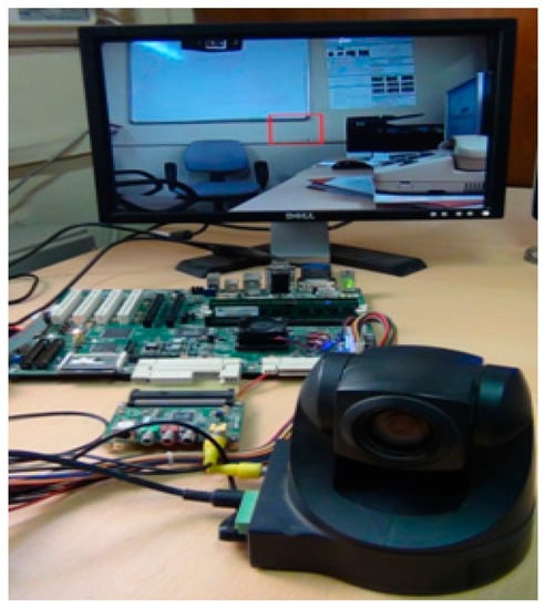 An FPGA-based object tracking system, using the image segmentation-based approach for a static background, was proposed by Yamaoka et al. []. It was designed and tested for the video resolution of 80 × 60 pixels. There are no discussions in the paper on the input/output video interfaces. Liu et al. [] have also implemented object tracking on FPGA for 80 × 60 pixel size downscaled images using background subtraction. Kristensen et al. [] have designed and presented a complete video surveillance system with input/output video interfaces for real-time object tracking using the background segmentation approach. Their implementation can track objects at a frame rate of 30 frames per second. The system was designed for a video resolution of 320 × 240 pixels, which is rather low as compared to the resolutions used by modern digital video surveillance systems. More recently, Chan et al. [] have developed an IP camera-based surveillance system using both the FPGA and the general purpose processor-based server. Their implementation is capable of processing 60 frames per second for PAL (720 × 576) size video resolution. As all four implementations [,,,] have used background segmentation-based approaches, they can do object tracking only in static background scenarios.