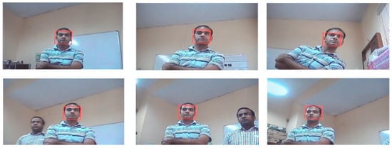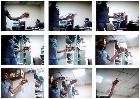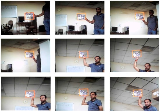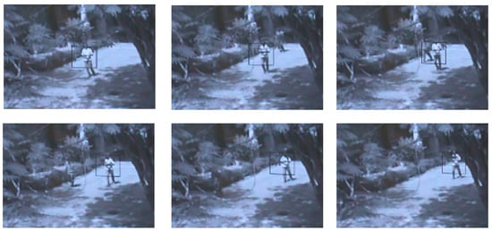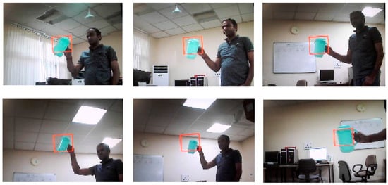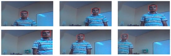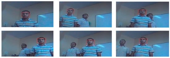Figure 14, Figure 15 and Figure 16 show the scenes where only the face of the person is tracked. The cases of complete object tracking are shown in Figure 17, Figure 18, Figure 19 and Figure 20. For testing of our implemented object tracking system, different environmental conditions (varying light intensities/different backgrounds/changing or dynamic backgrounds/indoor scenes/outdoor scenes/grey scale scenes) are considered. Figure 17, Figure 19 and Figure 20 show the object tracking results with automatic camera movement for indoor environments with varying light intensities and backgrounds, while Figure 18 shows the object tracking results for outdoor environment in grey scale video. In all cases (Figure 17, Figure 18, Figure 19 and Figure 20), the object to be tracked, identified in the initial frame, is tracked robustly throughout the video streams. We have tested the implemented object tracking system for 20 different video streams (length of 3–5 min) with different environmental conditions. Out of the 20 video streams, our implemented system tracks the initially identified object successfully in 19 cases, while failing to track in one case where the color of the complete object to be tracked is almost the same as that of the color of the background.