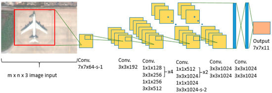 The proposed detection network has only 24 convolutional layers followed by two fully-connected layers. This condensed architecture significantly decreases the time for the object detection, while marginally reducing the classification accuracy of detected objects. The 26-layer configuration shown in Figure 2 is preferred for UAV applications due its high computational speed. According to the “YOLO” authors, alternating 1 × 1 convolutional layers reduces the feature space from that of the preceding layers. The final layer makes object classification supplemented by the probability that the selected object belongs to the class in question and the bounding box coordinates. Both bounding box height (h) and width (w); and x and y coordinates, are normalized to have values between 0 and 1.