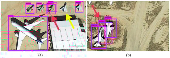 (a) Yellow arrow points at the instances where “airplane” object is present but not detected by the CNN, (b) red arrow points to the instance where “airplane” object is wrongly identified.