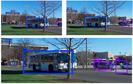Preliminary tests showed that the CNN was able to detect and identify different object classes in multi-object scenarios in real time from the video feed provided by UAVs with an accuracy of 84%. Figure 5 shows results from testing the algorithm on multi-object scenarios from UAV supplied video feed. Figure 5 shows the image sequence from the video feed in which the CNN is able to detect and recognize two types of objects: “car” and “bus”. The CNN was able to accurately detect and classify an object (class) in the image, even if the full contours of the object of interest were obscured by third object, for example, a tree was obscuring the full image of the bus. Furthermore, the CNN was able to classify and detect objects even if they were not fully shown in the image. For example, at the bottom image in Figure 5, only partial contours of two cars were shown and a full contour of the third car. Nevertheless, the CNN was able to accurately detect and classify all three objects as a “car” class.