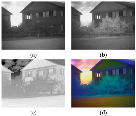 - The different sensor bands are fed into the R, G, B, channels (e.g., Figure 1d) to create an initial false-color fused representation of the multiband sensor image. In principle, it is not important which band feeds into which channel. This is merely a first presentation of the image and has no influence on the final outcome (the color fused multiband sensor image). To create an initial representation that is closest to the natural daytime image we adopted the ‘black-is-hot’ setting of the LWIR sensor.