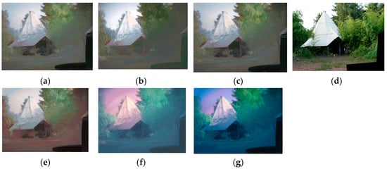 Results from color transformations derived from the standard training set applied to a different environment with different sensor settings: (a) CTN method; (b) LFF method; (c) SHT method; (d) daytime reference image; (e) CTN2 method; (f) SCF method; (g) R3DF method.