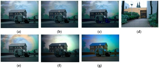 Figure 15 shows an example in which the color transformations were applied to an image recorded in a totally different environment (and with different sensor settings). Again, the CTN method transfers quite well to this new environment, while the two-band method performs less well. Finally, Figure 16 shows the results of applying the different color mapping schemes to a multiband image recorded in the standard environment, after they were trained on scenes representing a different environment (see Figure 16d). In this case, the resulting color appearance is not so natural as when the mapping schemes were trained in the same environment (see e.g., Figure 7a,c). Also here, the R3DF method (Figure 16g) appears to transfer well to this untrained situation (environment and sensor settings).