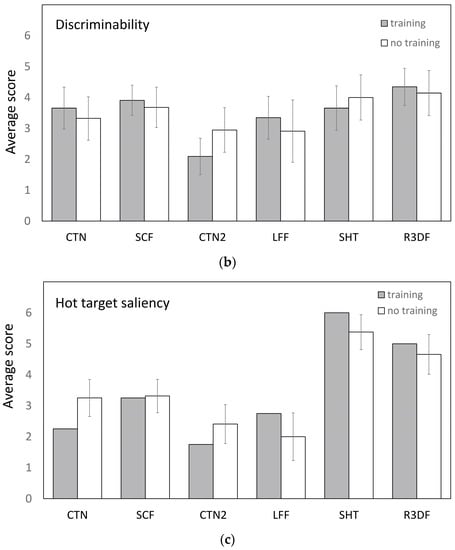 Figure 17b shows that the ratings on discriminability vary largely between observers, resulting in a low inter rater agreement. This may be a result of the fact that different observers used different details in the scene to make their judgments. In a debriefing, some observers remarked that they had paid more attention to the distinctness of vegetation, while others stated that they had fixated more on details of buildings. On average, the highest discriminability scores are given to the R3DF, SHT and SCF color fusion methods (in descending order).