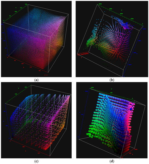 Vector-field representation of 3D LUTs [20]: source gamut is a regular cubic grid (not shown) whose points are mapped to an (irregular) target gamut. Each sphere in these graphs is a map between two RGB 3-tuples: the sphere’s hue as source and its position as target. (a) Creative “musical” look obtained via mild primary grading; (b) extreme creative look obtained via clipped primary grading; (c) Kodak Vision print film emulation (PFE) to Rec.709; (d) Inverse PFE into a HDR color-space.
