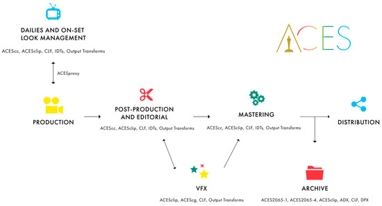 - Arrighetti, W. The Academy Color Encoding System (ACES) in a video production and post-production colour pipeline. In Colour and Colorimetry, Proceedings of 11th Italian Color Conference, Milan, Italy, 10–21 September 2015; Rossi, M., Casciani, D., Eds.; Maggioli: Rimini, Italy, 2015; Volume XI/B, pp. 65–75. ISBN 978-88-995-1301-6. [Google Scholar]