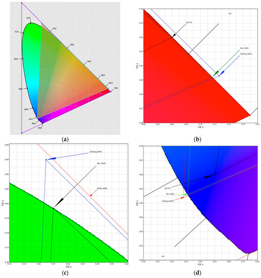Comparisons for ACES gamuts: (a) AP0 (purple) vs. AP1 (cyan, yellow-filled); (b–d) Details of several gamuts (AP0, AP1, P3, BT.2100) cross-coverage near the edges of the three color primaries.