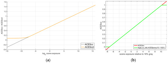 Figure 9. ACEScc transfer curve in a “EV/CV plot”, i.e., the log2 of scene exposure relative to 18% grey in abscissa (photometric stops) vs. CV range in ordinate. Compare with: (a) ACEScct; (b) ACESproxy. - ACESproxy is introduced to work with either devices transporting video signals (with integer CV encoding), or with intermediate hardware that supports integer-based arithmetic only (instead of floating-point) [34]. These include video-broadcast equipment based on Serial Digital Interface (SDI) among the former category; LUT boxes and references monitors among the latter. Such professional encodings are implemented in either 10 or 12 bits/channel, therefore two isomorphic flavors exist: ACESproxy10 and ACESproxy12. This is the elective encoding as long as it is used only for transport of video signals to endpoint devices (and processing finalized for such intents only), with no signal or data ever stored in, or re-converted back from ACESproxy. By design, it is an integer epimorphism of ACEScc (WARNING: not of ACEScct); it also scales CV to video-legal levels [34] for compatibility with broadcast equipment, as shown in Figure 9b, as they may include legalization or clipping across the internal signal paths. The conversion from ACES2065-1 is done applying (3) first, followed by either one of the two functions in Equation (7) (red for 10-bits/channel or blue for 12-bits/channel).