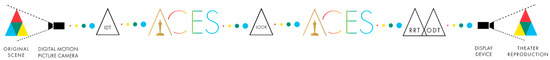 It is exactly in this context [14], that ACES was born back in 2004 by an effort of the Academy which, like it did in the past many times with theatrical technology breakthroughs (panoramic film projection formats, stereo and multi-channel sound systems, etc., cfr. [12]), coveted a group of scientists, engineers, cinematographers, VFX technical directors and other industry professionals, to find an accessible and vendor-neutral solution to the problem of moving picture color management. This time for the first time, the Academy-proposed solution lives in the realm of “(color) metadata”, is completely digital, open-source and supported by current internet/collaborative methodologies. The ACES project, initially called IIF (Interoperable Interchange Format), was then renamed “ACES” in 2012, when the author also officially joined the Academy internal group of experts. The first official version labeled 1.0 was released in December 2014 [1,15]. In fact, ACES ideas, software, formulas and techniques had been circulating among more experienced users and some vendors ever since earlier versions of it, so these are now usually addressed as “pre-release ACES”, as they may involve legacy terminology and standards. The whole ACES framework will be introduced in Section 3.