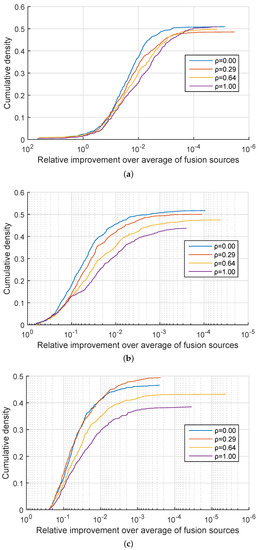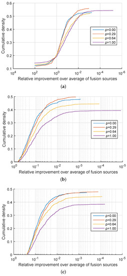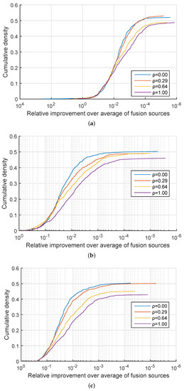 Synthetic data: relative improvement in the confidence of the correct information source identification of the proposed quadratic mean-based fusion over linear fusion, as the corresponding cumulative distribution function. (a) , ; (b) , ; (c) , .