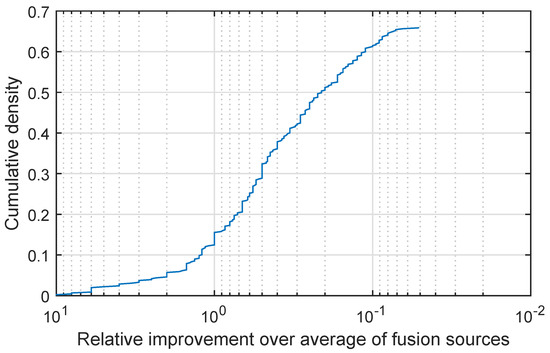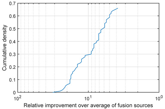 Arrhythmia prediction: relative improvement in the correct information source identification of the proposed quadratic mean-based fusion over linear fusion, as the corresponding cumulative distribution function.