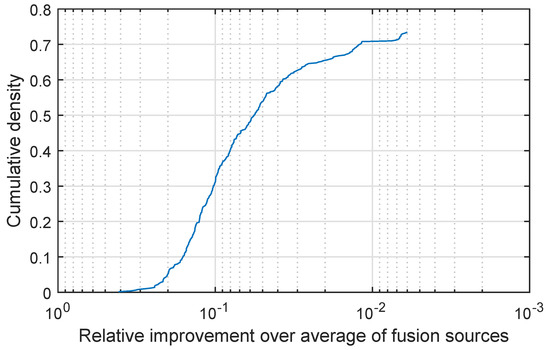 I followed the same evaluation methodology as in the preceding experiments. In the same vein I display my findings in Figure 6 which shows a plot of the cumulative density distribution of the relative improvement achieved by the proposed method (as before please note that the abscissa scale is logarithmic and that it is increasing in the leftward direction). Yet again, in agreement with the results obtained in all experiments I conducted, we can observe the same functional characteristics in the plot of Figure 6 and of those in Figure 1, Figure 2, Figure 3, Figure 4 and Figure 5. In further agreement with the previous experiments is my finding that in all instances of car accidents used for evaluation, the proposed fusion strategy did at least as well as the simple weighted fusion in terms of its predictive ability. With regard to this point, it is interesting to note that notwithstanding the remarkable qualitative similarity of the CDFs corresponding to different experiments, there are some quantitative differences. For example, note that in the present experiment approximately 73% of the cases resulted in superior performance of the proposed quadratic fusion and the remaining 27% in on a par performance. The proportion of evaluation instances yielding superior performance is thus higher than e.g., in the object recognition experiment described in Section 3.2. However, the resulting benefit is smaller. For example, while in the object recognition experiment about 30% of the evaluation cases result in at least 10-fold class separation increase, in the present experiment in no case is the benefit as large. This is most likely a consequence of the inherent information content in the data itself, rather than of some algorithmic aspect of the proposed method. In other words, the lesser advantage (though still consistent and observed in an overwhelming number of cases) of using the proposed method stems from greater redundancy across the fused information sources.