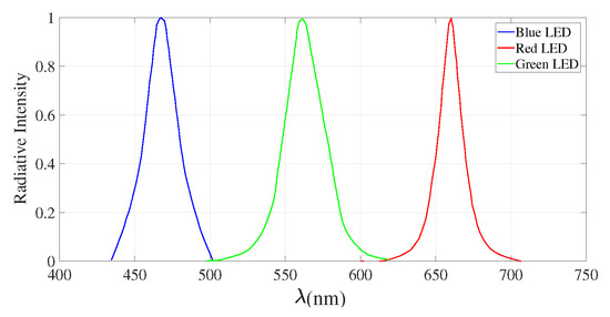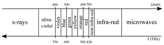 The new trend introduced by Internet of Things (IoT) devices and networks has brought a new perspective for off-the-shelf products’ research and development. IoT devices, such as smart watches, home appliances, smart lights, wearable devices and more, communicate among themselves mostly over a radio channel. High deployment of IoT wireless networks jointly with former consolidated radio protocols (i.e., WiFi, Bluetooth, etc.) is saturating the radio medium, increasing the interference between wireless devices and electromagnetic pollution. A recent and attractive solution is given by Visible Light Communication (VLC) [1,2], which allows transmitting data over the band of visible light (400 nm–700 nm or 430 THz–700 THz; Figure 1), by the use of illumination systems. VLC technology is designed to exploit the energy used to light up the environment in order to transmit data while illuminating. This particular characteristic of VLC systems allows one to obtain considerable energy savings in data transmission, especially with the use of LEDs as optical sources. Whereas the information is transmitted by light in the visible spectrum, the signal is confined within the surrounding environment that is illuminated, thus reducing interference with other VLC systems. Furthermore, an additional first physical security level for the channel access is also guaranteed with respect to wireless radio networks, since the light is generally bounded by dividing walls of indoor environments. Sending information from a lamp is possible by the use of light modulation schemes, which result in being easier to implement through LED devices instead of bulb lamps. The information is thus related to the presence of light (on/off) by controlling the blinking of the device. The human eye is not able to perceive the switching of the LED if the blinking rate of the LED transceiver is greater then 50 Hz [3], but it perceives a static image of the LED lighted. To avoid harming human eyes, a frequency of at least 200 Hz is recommended [1].