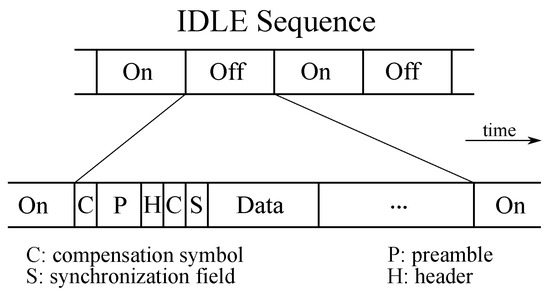 During the off time of the idle sequence (Figure 2), the standard allows the data transmission on the optical channel, using the On-Off Keying (OOK) modulation with a Variable Pulse Position Modulation (VPPM) for the physical levels PHYI and PHYII (see Figure 3) or a Color Shift Keying (CSK) [2,4,5] in the PHYIII band. Sending data with the above modulation techniques requires the control of the dimming of the light source, in such a way so as to maintain the user-selected brightness settings. This result is achieved by inserting compensation symbols in the frame and adjusting the pulse width of the transmitted symbols.