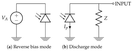 When the red LED is in reception mode (Figure 4a; reverse bias or photo-conductive mode) and a red light is illuminated on it, there is a photo-current proportional to the incident red optical power , , with R the responsivity of the device. Therefore, if a blue incident light is considered, , a photo-current is generated, and this is due to the lower responsivity of the red LED to blue photons. Such sensitivity is due to the probability that the incident photon can generate an electron-hole couple, and this depends on the energy of the photon itself, the material of which the semiconductor is composed and also on the junction dimension.