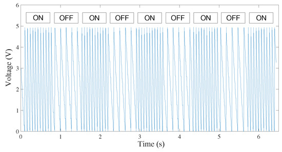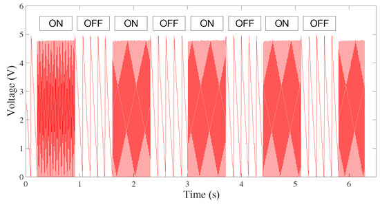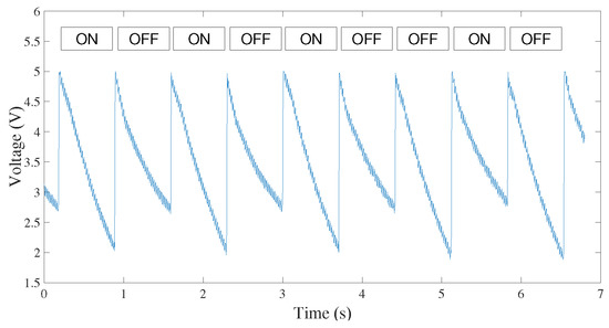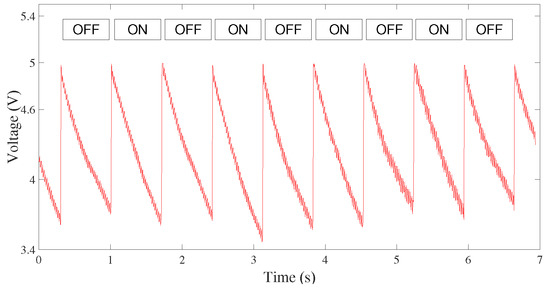 The results obtained from the measurements are depicted in Figure 7 and Figure 8, where it is possible to observe that the trends of the detected voltages differ significantly when the transmission is realized with a red- or blue-transmitting LED, since each color corresponds to different energy values. The different voltage trends during the acquisition of the ON signal in Figure 7 and Figure 8 are due to the different discharge times of the reverse polarization voltage , which is supplied to the LED during the reception phase of Figure 4a. The duration of the voltage discharge is given by the current circulating on the semiconductor and the size of the capacity that is placed on the device, due to the polarization and material characteristics. The discharge time can be measured directly from the figures, and the value obtained is ms for the red-to-red link and ms for the blue-to-red link.