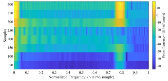 The two transmitters can be distinguished by the slope of the curves (Figure 7 and Figure 8); in fact, the red LED’s slope in the ON state is V/s, while that of the blue one is V/s; finally, the slope of the OFF state is a comparison term and is equal to V/s. To complete the analysis of the signal produced by the receiving red LED, Figure 9 represents the spectrogram of the Short-Time Fourier Transform (STFT) of the signal. In order to reduce the windowing, the flat top function is applied to the signal from the first ON sample to the last OFF sample, in order to make the endpoints of the waveform connected together. It is possible to notice the presence of the DC component, as well as the frequencies of the different discharge trends, which are = (146.6 ms)−1 = 6.8 Hz and = (12.4 ms)−1 = 80.1 Hz.