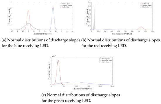 The blue-to-blue signal is depicted in Figure 11, where it is possible to distinguish between the ON and OFF states simply by observing the different slopes, since now, the energy of the blue transmitted photon has a better probability of generating an electron-hole pair in the semiconductor sensing device and thus to discharge the capacitance faster. The values obtained from the measurement of this link are V/s and V/s. A deep analysis is conducted to evaluate the statistical differences between the OFF and ON states of the blue receiving LED (Figure 10 and Figure 11). For each optical source (red, blue and ambient), 4000 discharge slopes on the receiving blue LED are sampled to calculate the mean and standard deviation of the curves. These results are shown in Figure 12a as three normal distributions, each one representing the statistical pattern of a specific link. The overlap of the red-to-blue and ambient-to-blue curves indicates that there is not a statistically-significant difference between these discharge trends. In fact, the blue LED is less sensitive to red sources, since red’s wavelength is greater than blue [6,15,16]. For completeness, the normal distributions for red (Figure 12b) and green (Figure 12c) receiving LEDs are also shown.