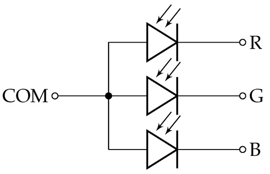 In the previous section, the results presented show that a monochromatic LED can also function as a light sensor and how it works when affected by different colors. It is thus interesting to analyze the behavior of an RGB LED (Figure 13) when stimulated by one or more incident colors, so evaluating the possibility of using this type of device for transmitting and receiving VLC modulations, like CSK [2,4,5].