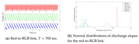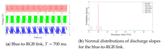 Since LEDs are able to detect wavelengths shorter than they emit in a range not exceeding 100 nm [6,12,15,23], the green and blue channels are able to correctly detect the transmitting blue LED for the blue-to-RGB link better than the red channel as shown in Figure 15a. This behavior of receiving LEDs is also marked during the OFF state. In fact, since the red’s wavelength is the longest, the red LED can better detect the ambient light with respect to the green and blue, leading to a faster discharge during the OFF state. The resulting parameters are V/s, V/s and V/s.
