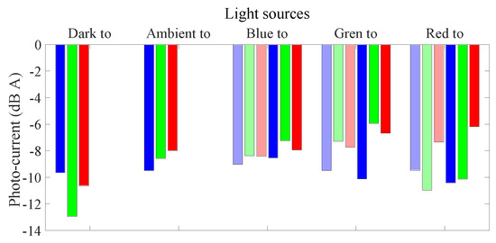 In the previous section, the capacitance discharge times of LED diodes were compared, and their correlation with the incident light wavelength (or photon energy) over the receiving LED has been shown. In order to validate the results obtained by the previous analysis (Section 1.1), this section presents photo-current measurements made with a testbed composed of a Semiconductor Parameter Analyzer 4145B and a Text Fixture Personality 16058A device. The measurements were made in a closed box (Text Fixture Personality 16058A) to avoid interfering noise from environmental lights, while the current was measured by the Semiconductor Parameter Analyzer 4145B. The first measurement is realized by biasing a transmitting LED with a forward current of 5 mA, and the photo-current values are sampled on the receiving LED (lighter bars); the second measurement is realized with a transmitting LED biased at 20 mA (full color bars) Figure 16.