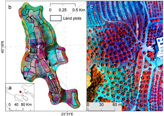 Figure 1. Imaging of the olive plantation under study: (a) the location of the study site in Chalkidiki, Greece; (b) the imaged extent after masking; (c) a close view of a false-colour image composite.