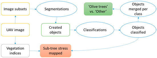 The segmentation targeted the creation of image objects corresponding to sub-tree features (rather than the entire tree crown), while the classification divided the produced objects into two categories, namely ‘Olive trees’ and ‘Other’. The objects classified as ‘Olive trees’ have the potential to be used as units of tree-stress assessment at a sub-tree scale, using vegetation indices suitable to indicate known stresses [15,16]. All the classified objects can be merged per class to create a binary classification map (Figure 2).