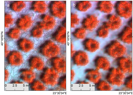 Figure 3. Segmentation and classification results: (a) close view of the segmentation; (b) objects classified as ‘Olive trees’ (in the same extent); both layers are overlaid on a false-colour composite of the multiSPEC 4C image.