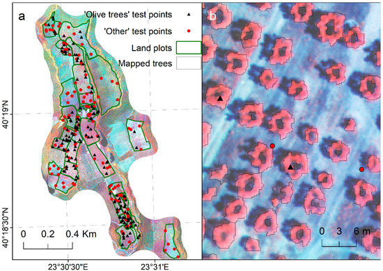 Figure 4. The sampling scheme for the thematic accuracy test: (a) an overview of the test points throughout the olive plantation; (b) a close view of the samples in relation to tested features.