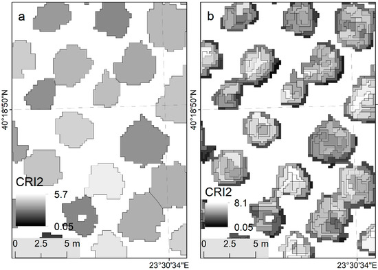 Figure 5. The CRI2 index mapped: (a) per tree crown (mean = 2.2, std. = 0.321, max = 5.77); (b) per sub-tree object (mean = 2.2, std. = 0.513, max = 8.10).