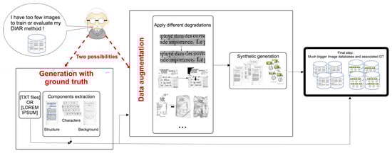 According to the needs of the DIAR researcher, it is possible to generate synthetic document images (and their ground truth) in different ways. First possibility: if a researcher has real document images but without any ground truth, DocCreator can generate synthetic images that look like the real ones, and of course, with the associated ground truth. Second possibility: a researcher has a ground-truthed database but it is too small or not heterogeneous enough. DocCreator provides several degradation algorithms to augment the dataset. By degrading text ink, paper shape or background colours it is possible to create a representative document image database where many defects are present. This complete database is finally useful for very precise performance evaluation or to provide multiple cases for retraining processes (in algorithms embedding a learning step).