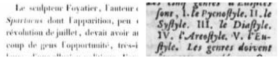 We also propose to evaluate the capacity of our method to correctly predict the OCR recognition rate by comparing original images with their synthetic version generated with exactly the same text (see Figure 11 to compare the original images and their synthetic versions). These images are generated following this protocol: (1) pages from three books (2 typewritten and 1 manuscript book) have been manually transcribed; (2) font, background and layout are automatically extracted from original images; and (3) font, background and layout are finally used with the transcribed texts to automatically generate synthetic versions of the original ones. The whole database is composed of 93 document images containing 18.240 words and 115.622 characters.