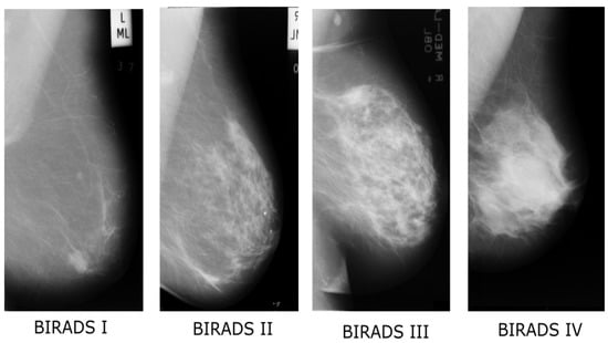 Therefore, an accurate breast density estimation is an important step during the screening procedure because women with dense breasts can be six times more likely to develop breast cancer [1,2]. Although most experienced radiologists can do this task, manual density classification is impractical, tiring, time-consuming and often results vary between radiologists. Computer Aided Diagnosis (CAD) systems can reduce these problems providing robust, reliable, fast and consistent diagnosis results. Currently, in the US, breast density is visually assessed by radiologists who classify density according to the fourth edition of Breast Imaging-Reporting and Data System (BI-RADS) into four classes based on the following criteria: (a) BI-RADS I (0–25% dense tissues, predominantly fat); (b) BI-RADS II (26–50% dense tissues, fat with some fibro-glandular tissue); (c) BI-RADS III (51–75% dense tissues, heterogeneously dense); and (d) BI-RADS IV (above 75% dense tissues, extremely dense) used in this study. Figure 1 shows four examples of breasts with different BI-RADS classifications.