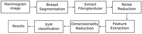 Figure 2 shows an overview of the proposed methodology. Firstly, we segment the breast area and estimate the area. Subsequently, we use a simple median filter using a sliding window for noise reduction and employ the multiresolution LQP operators with different neighbourhood topologies and orientations to capture the microstructure information within the . For dimensionality reduction, we select only dominant patterns in the feature space to remove redundant or unnecessary information. Finally, we train the Support Vector Machine (SVM) classifier to build a predictive model and use it to test each unseen case.