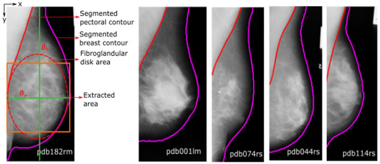 To segment the breast and pectoral muscle region, we used the method in [30], which is based on Active Contours without edges for the breast boundary estimation and contour growing with edge information for the pectoral muscle boundary estimation. The leftmost image in Figure 3 shows the estimated area. To extract , we find , which is the longest perpendicular distance between the y-axis and the breast boundary (magenta line in Figure 3). The width and the height of the square area of the (amber line Figure 3) can be computed as with the centre located at the intersection point between and lines. is the height of the breast, which is the longest perpendicular distance between the x-axis and the breast boundary. is then relocated to the middle of to get the intersection point. The size of the varies depending on the width of the breast. Figure 3 shows examples of segmentation results using our method in [30].