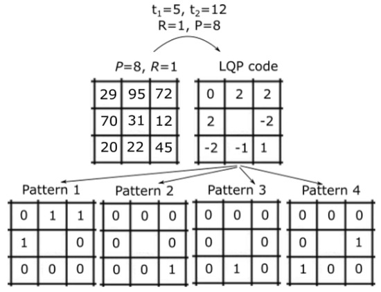 In the feature extraction stage, we used the LQP mathematical operators to extract local pattern information within the , which is a variant of Local Binary Pattern (LBP). The LBP operators were first proposed by Ojala et al. [31,32] to encode pixel-wise information. The value of the LBP code of the pixel is given by: