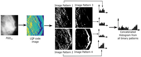 Figure 6 shows four images of binary patterns generated based on the conditions in Equations (6)–(9). The LQP code image is generated using the term in Equation (5). All histograms from binary patterns are concatenated to produce a single histogram. This process is repeated depending on the number of resolutions chosen by the user. In the proposed approach, this process was repeated three times as we used three different resolutions such as , , .
