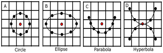 The typical neighbourhood topology used in the LBP operators is a circle. In this study, we are interested in investigating the effects of the proposed method when using different neighbourhood topologies. For this purpose, we employed three further topologies, namely ellipse, parabola and hyperbola, as illustrated in Figure 7, where eight neighbours (black dots) were used and distributed equally. The central point is represented by the red dot in each topology. The value for each neighbour is the gray level value of a pixel that is located nearest to it. We summarise the equation and parameters involved in Table 1 for each topology as defined by Nanni et al. [35].