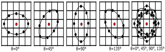 To investigate the effect on the performance at various orientations (), we conducted several experiments by varying with the following values: (which is the default orientation), , and . The parameter values remain the same for all medium size multiresolution approaches with []. Therefore, the new parameter settings are presented in Table 3. Note that only the circle and ellipse topologies are tested due to their promising results presented in Section 4.4. Combining different orientations for the ellipse results in the neighbourhood architecture becoming more complex as presented in the rightmost image in Figure 8. To assess the effect of a single orientation, first, we set a constant value of across different resolutions. For example, for the circle (), (from now on, we call it , where ). Secondly, we vary the value of (as presented in Table 3), hence the parameters are (from now on, we call it , where * indicates all four orientations).