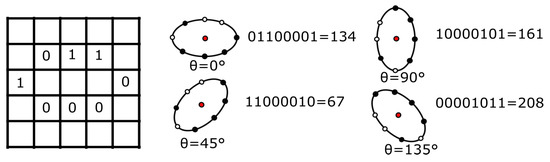 Topology orientation can be achieved through spatial rotation of the binary pattern. To illustrate this process, consider Figure 9, which represents a binary pattern in an ellipse topology (for simplicity, assume that the pattern was generated after the process in Figure 6 was implemented). In this example, the initial decimal value for the binary pattern 01100001 is 134 but rotating the pattern at produces a new decimal value of 67 (binary pattern becomes 11000010). Similarly, rotation at and result in 161 and 208 decimal values, respectively. The same rotation process applies to the circle, parabola and hyperbola topologies.
