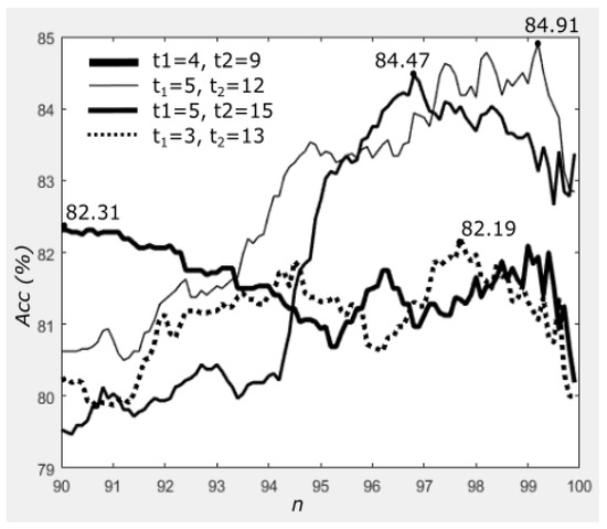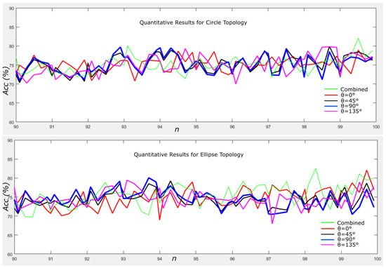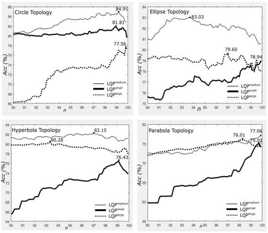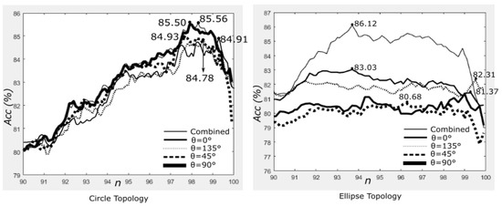 For the threshold values, we have investigated several combinations of and found that and produced the best accuracy for all experiments. However, for comparison, we report the performance of the method using , and for the circle topology. We also show the effect on performance when varying n from 90 to 99.9 with intervals of 0.1.