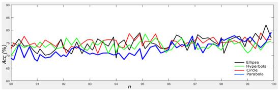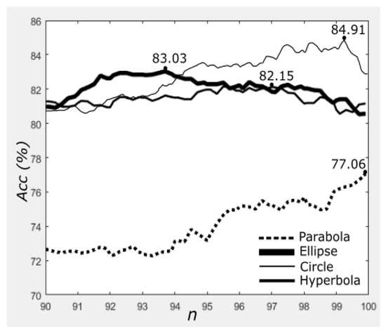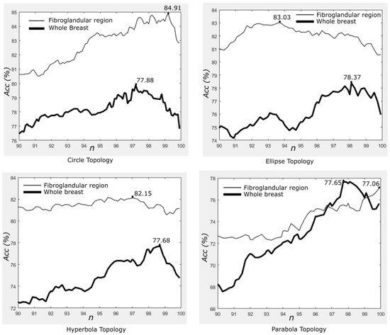 We further tested the proposed method using the InBreast dataset [15] and present the results in Figure 15. All associated parameters are the same as in Table 2. It can be observed that the ellipse topology performed the best with over accuracy at , whereas the circle topology produced close to at and . The parabola topology achieved the highest accuracy () at and at for the hyperbola topology. On average, the proposed method achieved , , and accuracy for the circle, ellipse, hyperbola and parabola, respectively, across different n.