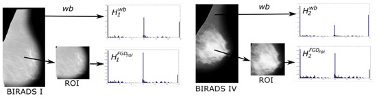 Histograms extracted from the versus region of interest (ROI) with BIRADS class I and IV.