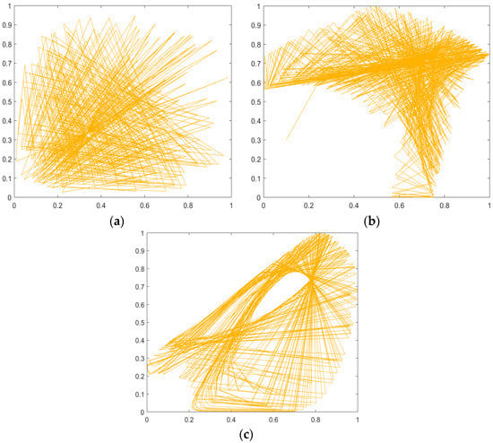 Trajectories of (a) the proposed 2D-STCM Map; (b) 2D-SLMM Map and (c) 2D-Logistic Map.