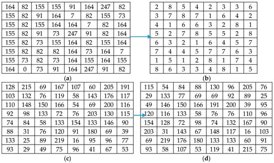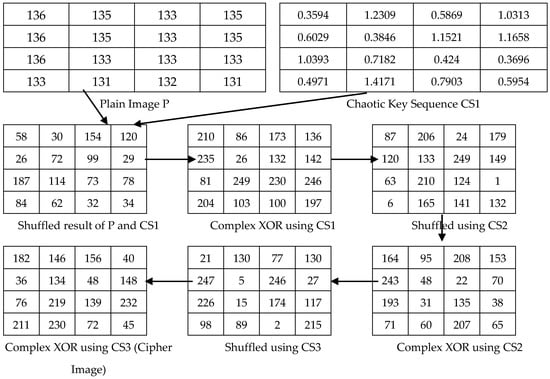 In Figure 3, an example is shown with the help of an 8 × 8 sample matrix. The process starts with the sorting of chaotic key sequence column-wise and save its index matrix for further use. In the next step, permute the location in P using the index matrix IM. For example, consider the first row of IM as (2, 8, 5, 4, 2, 3, 3, 6) then the pixel locations of P ((2,1), (8,2), (5,3), (4,4) … (6,8)) will be connected into the circle and will shift 1pixel positions to the left. Similarly, on second iteration, the pixel positions will get permuted with the left shift of 2 pixels and so on.
