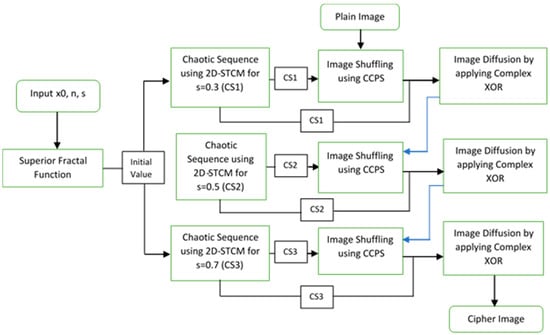 The proposed image cryptosystem consists of four following sections to achieve a secure system: (1) an Initial value generation using superior fractal function; (2) a key stream generation using 2D-STCM; (3) a plain image shuffling process using CCPS; (4) an image diffusion process by applying complex XOR operation. The further sections will discuss in detail the function of each method.