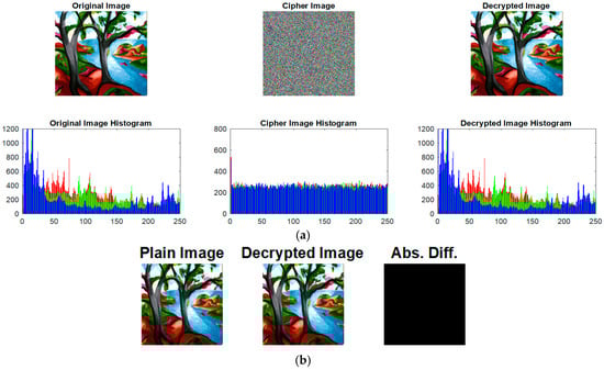 The effect of proposed method can be realized by seeing the cipher image and its histogram. A histogram of a plain image has a specific pattern which gives an idea about the image structure. An evenly and randomly distributed pixel values of the cipher image prove the randomization of the output value. Therefore, a histogram generated by uniform pixel value distribution makes it difficult to obtain any information by the hacker. Also, an absolute matrices difference between the plain image and the decrypted one is also shown in the below figure.
