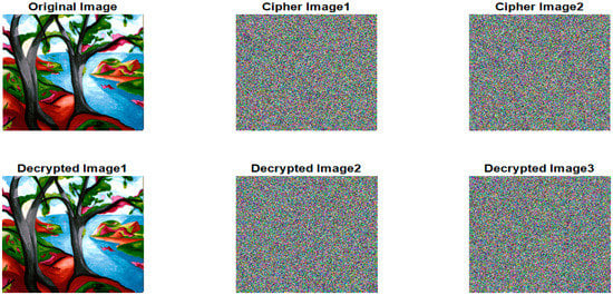 The below I part of Figure 8 shows the encrypted and decrypted images obtained after making a slight change in the security key. The decrypted image 2 is obtained by changing x0 from 0.0 to 0.0001 and that is totally changed from the expected one. Even after changing the key initial value by 10−6, nobody can guess the actual plain image from the obtained decrypted image 3. The output images are completely different and unrecognizable, which ensure the key sensitivity in both encryption and decryption process.