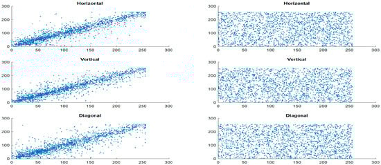 Here, x and y are adjacent pixels in a plain image or cipher image of size M × N. The Figure 9 shows the distribution of adjacent pixel pairs of the plain image and its cipher image in horizontal, vertical and diagonal direction. The pixel pairs of plain image are mostly located nearby the diagonal line in the graph, means they all are close to each other or have equal values. Whereas, in case of cipher image, pixels are randomly distributed covering entire data range, depicts that they are not related to each other. The low correlation between the pixels makes it non-vulnerable by the attacker only by getting the adjacent pixel pair information.